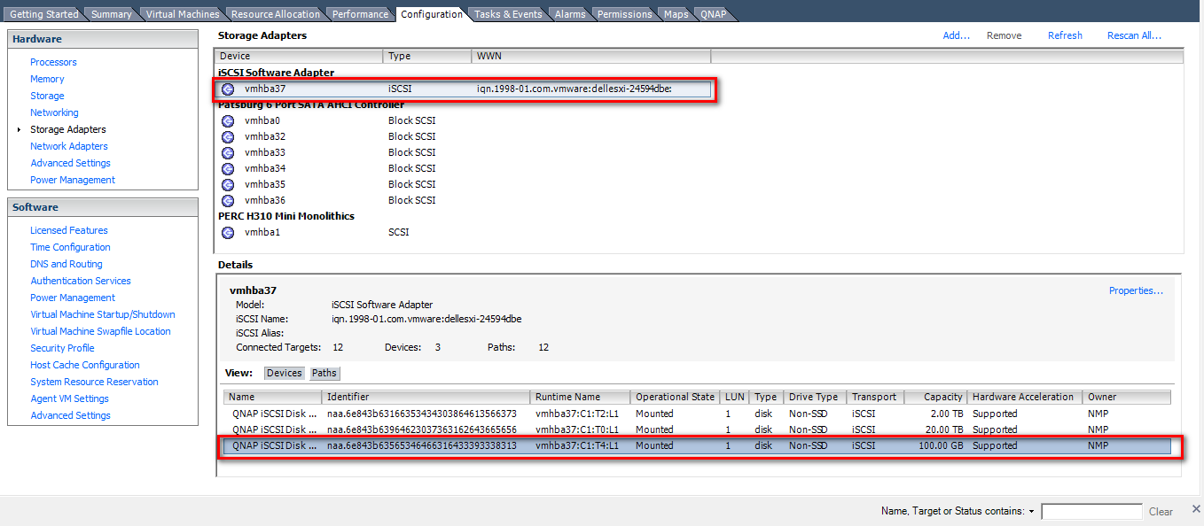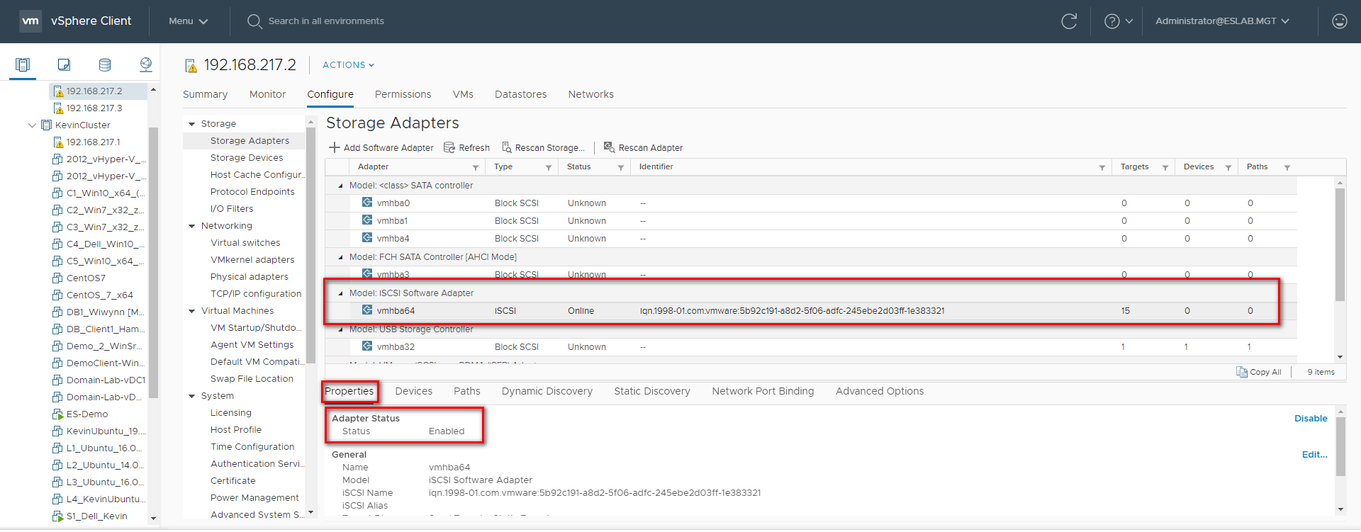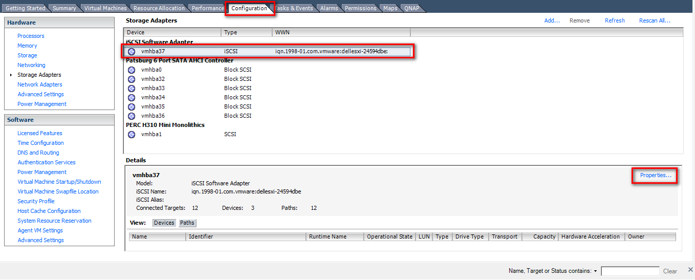 Step 2: A new software iSCSI adapter will be added to the Storage Adapter list. Select the software iSCSI adapter on the list and click “Properties” to ensure the adapter is enabled.