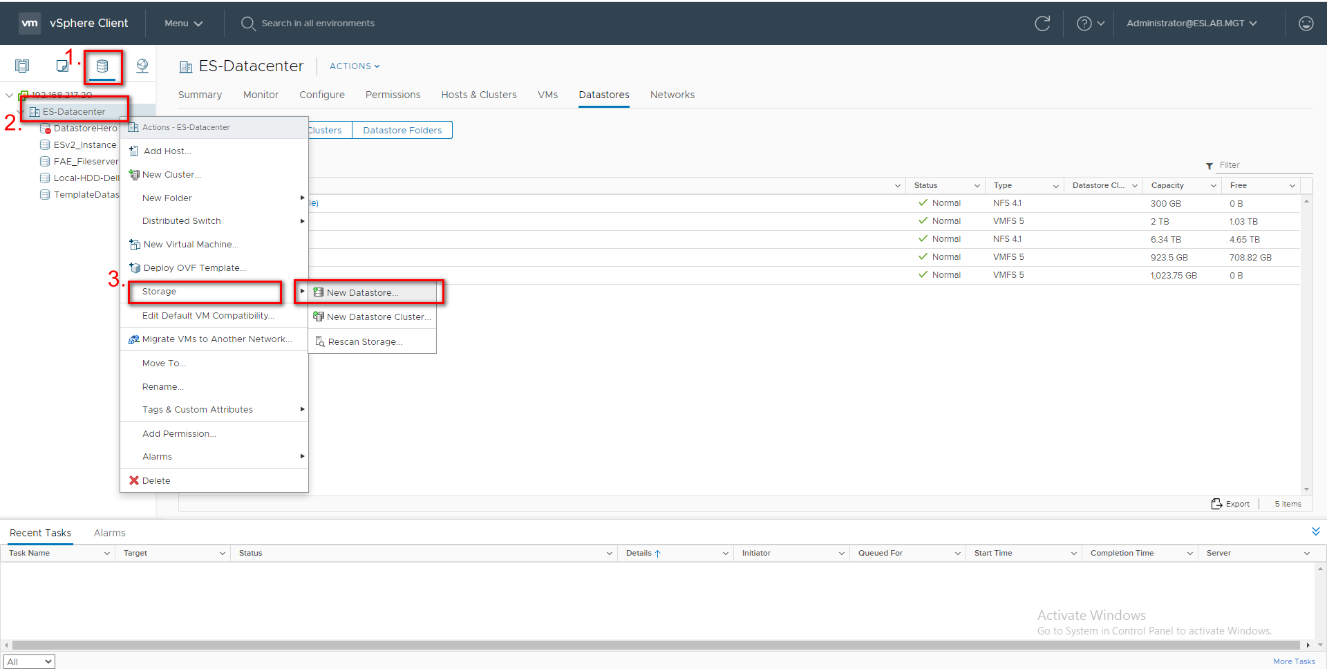 Step 8: Go to the “Storage” tab and right click on the Datacenter. Select “Storage” > “New Datastore…”.