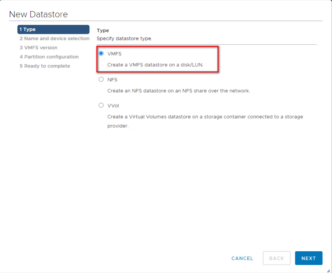 Step 9: Select “VMFS” as the Type and click “Next”