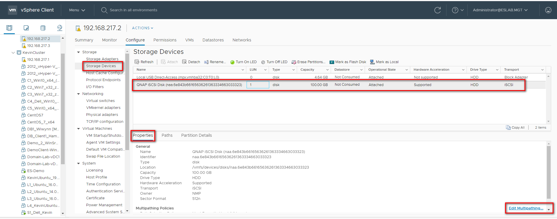 Step 6: Click “Storage Devices”, select the iSCSI Disk, and then click “Properties” > “Edit Multipathing…”