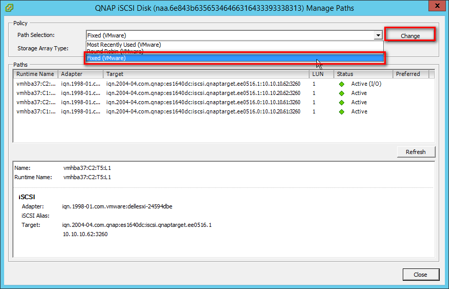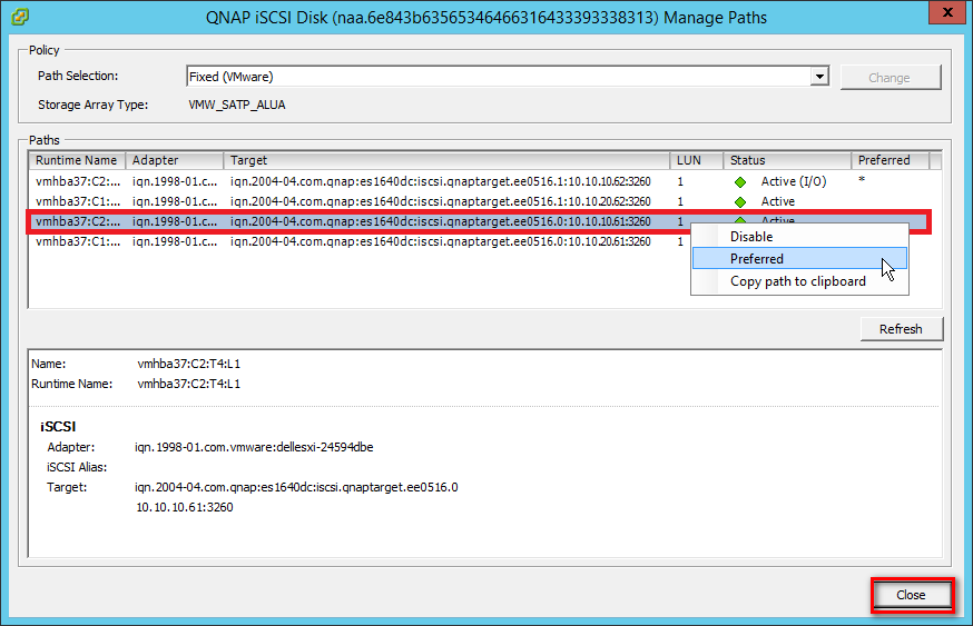 Step 7: Select “Round Robin (VMware)*” in Path selection policy, then select one path as the preferred path and click “OK”.
