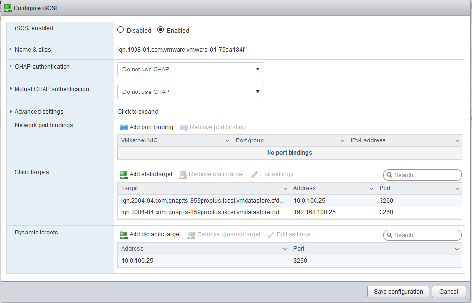 Click «Configure iSCSI» to bring up the properties page of the iSCSI adapter, you should see the list of iSCSI targets that the NAS is reporting back. You may see just the one, or several if the NAS has more than one NIC and those are active.