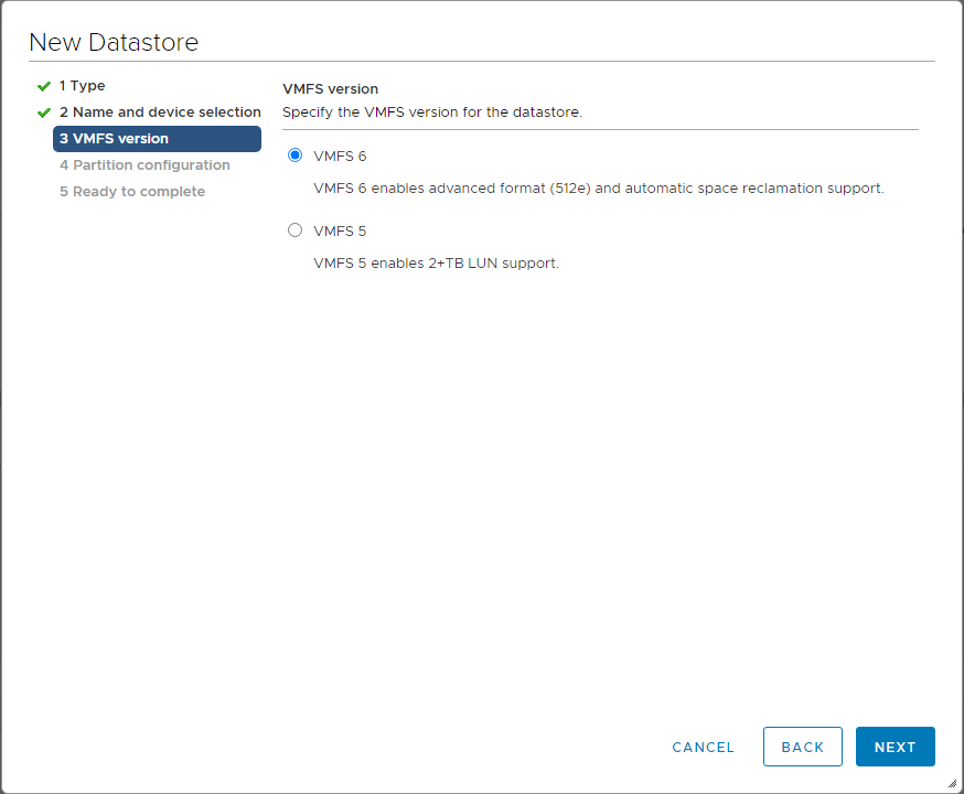 Step 11: Select VMFS 6 or VMFS 5 and click “Next”.