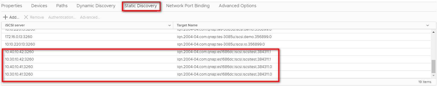 Step 3: Click “Dynamic Discovery” and then click “Add…” to add the data ports’ IP addresses of both controllers. Then go to “Static Discover” tab to view the names and IP addresses of these targets. If you remove a static target added by dynamic discovery, the target might be returned to the list the next time a rescan happens, the HBA is reset, or the host is rebooted.