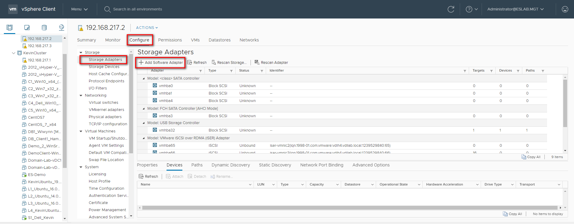 Step 1: Log in to the vSphere Web Client and select a host from the inventory panel. Go to the “Configure” tab and then the “Storage Adapters” tab. Click “+ Add Software Adapter” to add a new storage adapter.