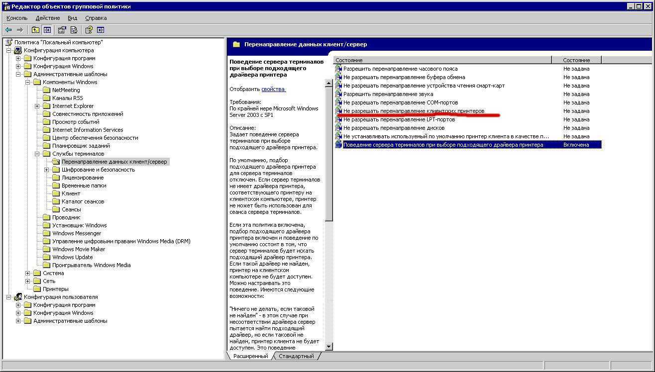 Слава Гейтсу, существует и альтернативное решение, а именно, подстановочный драйвер. Дело в том, что несмотря на различия, большинство принтеров имеет много общего и, невероятно, но факт, на них можно печатать с использованием унифицированного PCL или PS драйвера. Подстановку унифицированного драйвера можно задать только с помощью групповых политик, поэтому для установки соответствующих настроек администратору следует на контроллере домена запустить gpmc.msc (если её нет, то dsa.msc) и открыть интерфейс редактирования политики, относящейся к данному терминальному серверу. Если же сервер терминалов не входит в домен и является т.н. «stand-alone» сервером, то на нём также есть локальные групповые политики, которые можно отредактировать при помощи gpedit.msc. Интерфейс в обоих случаях одинаковый, поэтому инструкции подойдут для обоих случаев: