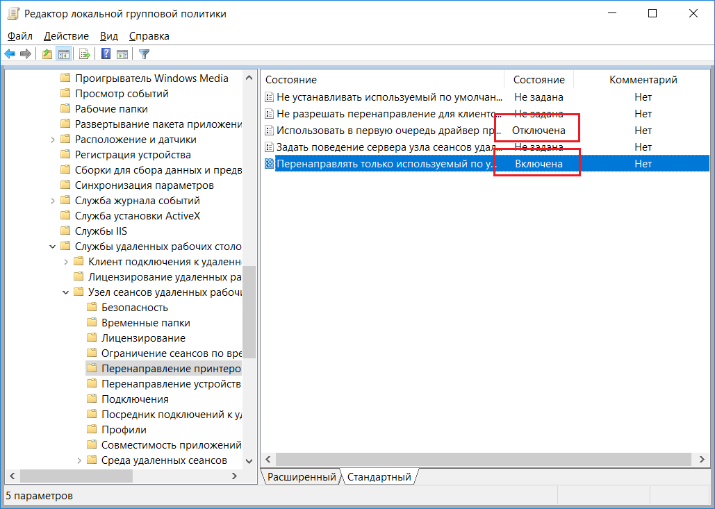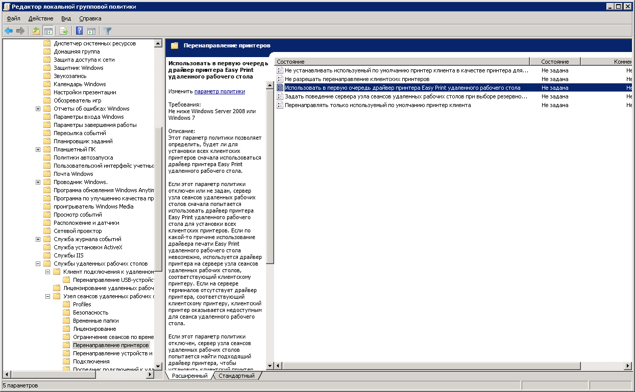 Откройте редактор локальной групповой политики (нажмите Win + R и введите команду gpedit.msc). Перейдите в Конфигурация компьютера\Административные шаблоны\Компоненты Windows\Службы удаленных рабочих столов\Узел сеансов удаленных рабочих столов\Перенаправление принтеров. Установите политики Использовать в первую очередь драйвер принтера EasyPrint и Перенаправлять только используемый по умолчанию принтер клиента> так, как показано на рисунке ниже.