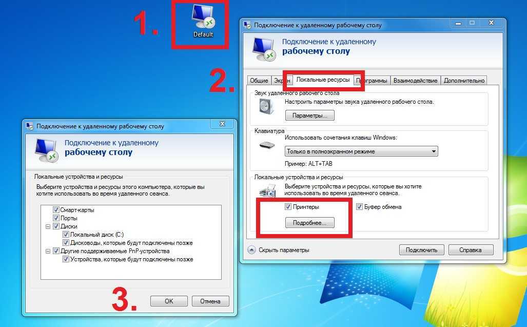 - В параметрах RDP подключения на вкладке Локальные ресурсы (Local Resources) в разделе Выберите устройства и ресурсы, которые вы хотите использовать во время удаленного сеанс должна быть отмечена опция «Принтеры»