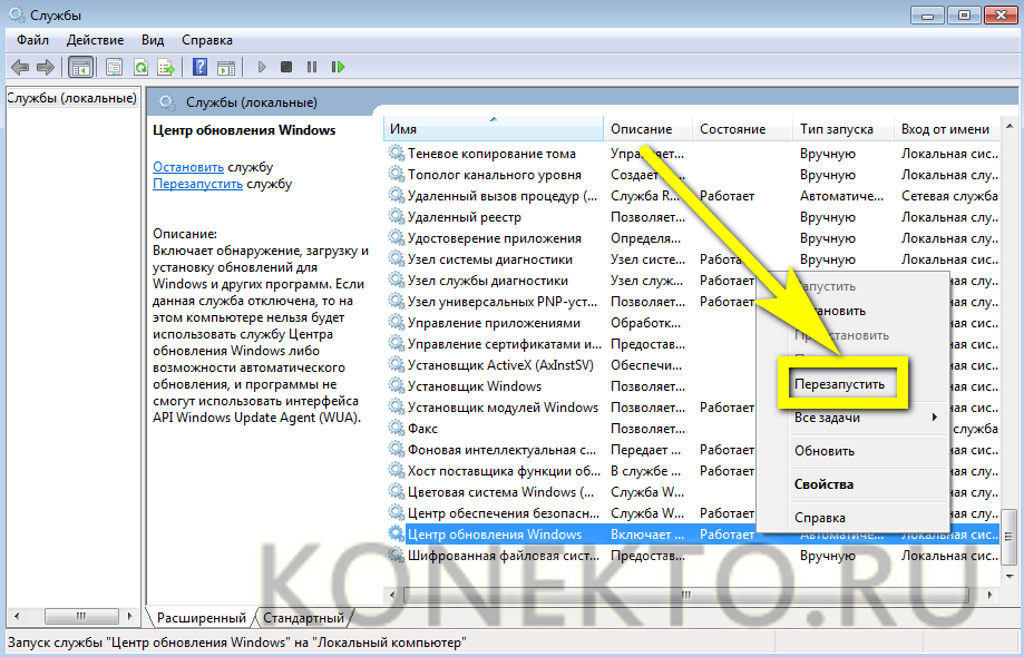Если первый способ испробован и не дал результатов (обновления Виндовс 7 по-прежнему не устанавливаются или грузятся бесконечно долго), стоит остановить текущий процесс и выполнить перезагрузку службы.