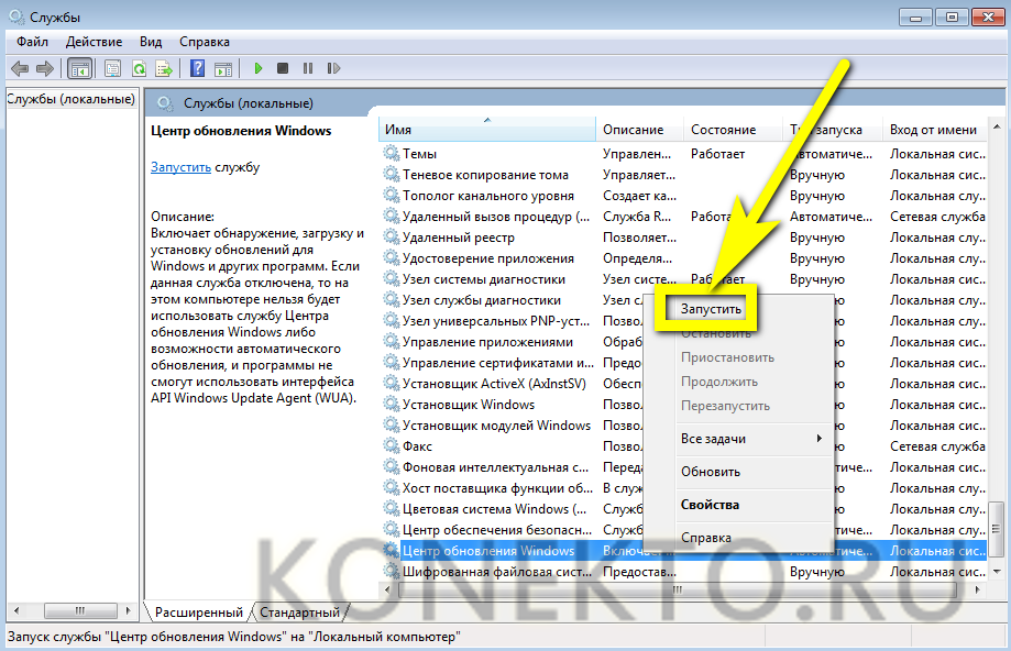 После загрузки системы подключите Интернет и включите службу центра обновления Windows(кликните на ней правой кнопкой мыши и выберите «Запустить»).