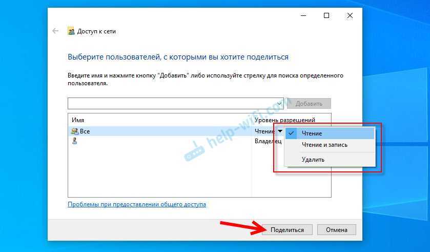 Дальше нужно выбрать пользователя, для которого будет предоставлен общий доступ к папке. В домашней сети можно выбрать «Все». В таком случае доступ к файлу/папке будет у всех участников сети. Можно создать нового пользователя и использовать его имя/пароль для доступа к папке с других компьютеров (если вы не отключали общий доступ с парольной защитой).