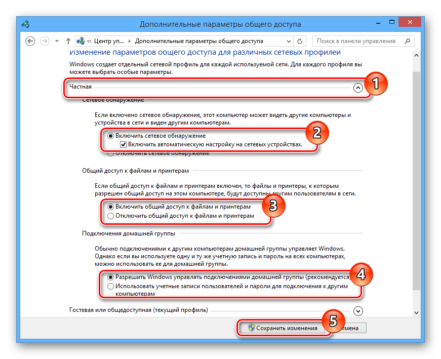 Здесь нужно для своей локальной сети поставить флажки «Включить сетевое обнаружение», «Включить доступ к файлам и принтерам» и «Разрешить Windows управлять подключениями домашней группы». Сохраняем изменения.