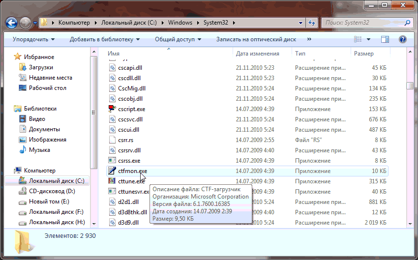 Если языковая панель не появилась после всего перечисленного выше, необходимо убедиться в том, что в папке «system32», находящейся на диске C в разделе «windows», присутствует файл «ctfmon.exe» (см. рисунок). Если он есть, нужно запустить его (двойным щелчком мышки). Если такого файла нет – необходимо предварительно скопировать его в эту папку с другого компьютера с аналогичной версией Windows.