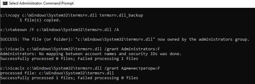 icacls c:\Windows\System32\termsrv.dll /grant Administrators:F (или Администраторы в русской версии Windows). Должно появится сообщение: «processed file: c:\Windows\System32\termsrv.dll Successfully processed 1 files; Failed processing 0 files«.
