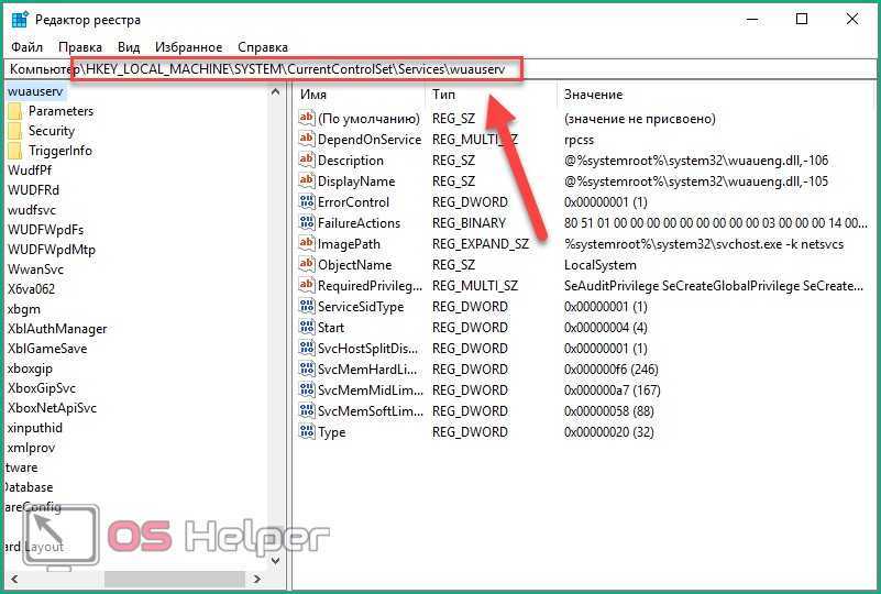 - В редакторе реестра найти ветку HKLM\System\CurrentControlSet\Services\wuauserv. Достаточно скопировать путь из данной инструкции и вставить его в строку поиска вверху окна.