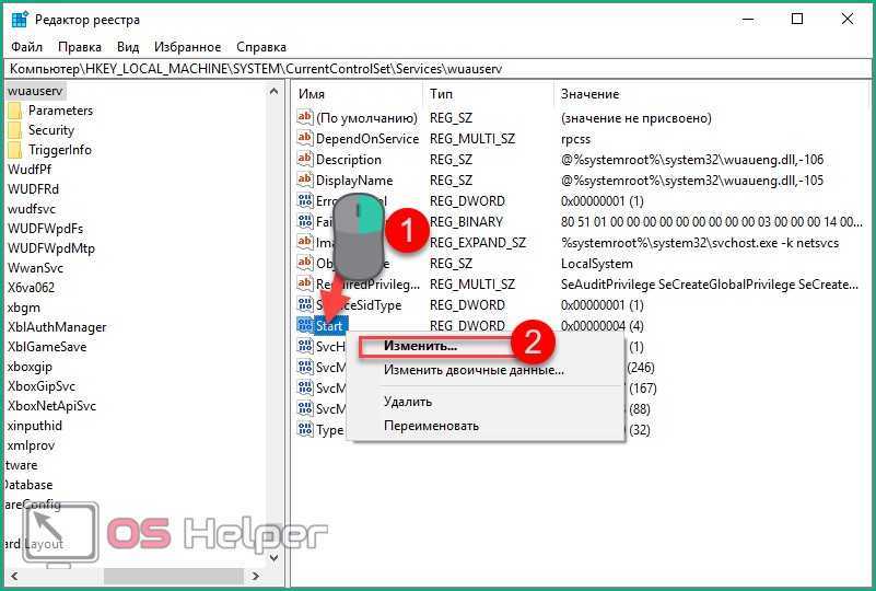 - В правой части окна будет находиться параметр «Start». Кликните ПКМ для выбора в меню пункта «Изменить».