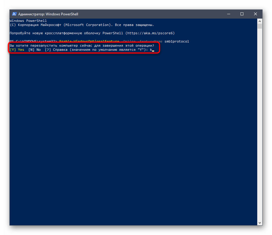 Если технология не активировалась сейчас, потребуется перезагрузить компьютер, ведь именно тогда происходит обновление параметров реестра, что и требуется для корректной работы SMB.
