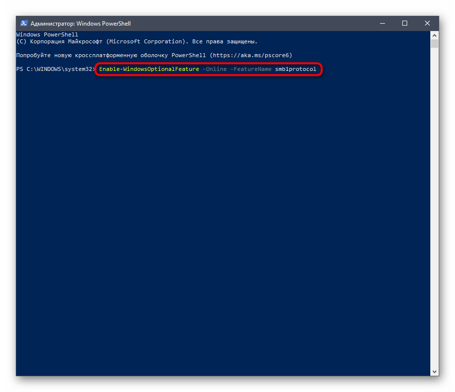 Если вы не боитесь взаимодействовать с оболочкой PowerShell, активировать SMBv1 можно через нее, вставив всего одну команду.