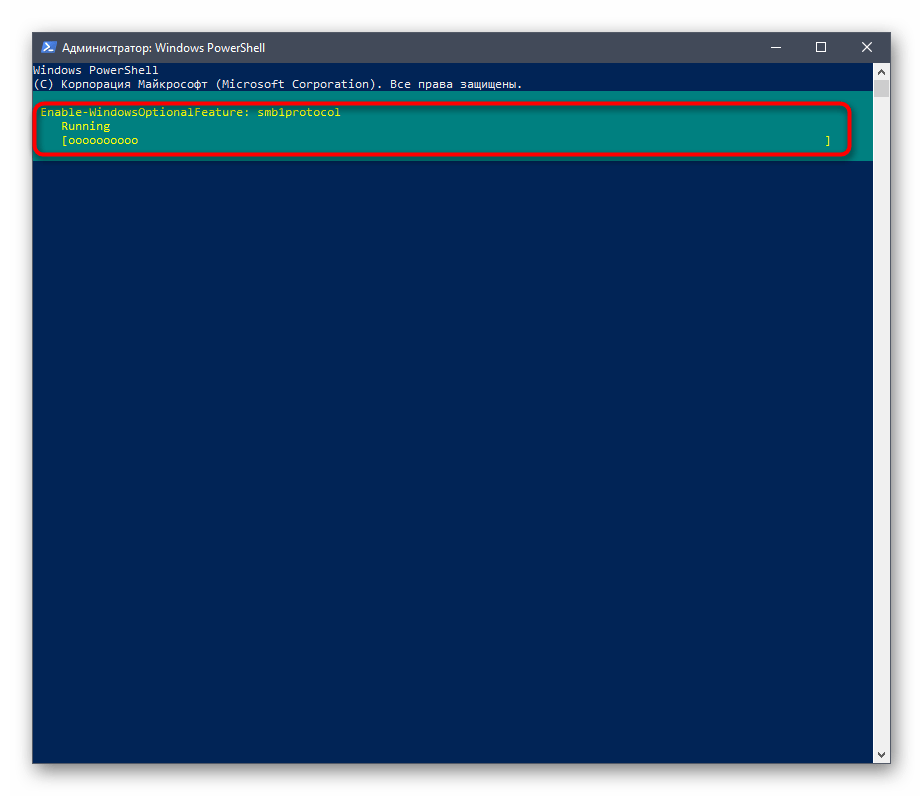 Далее в PowerShell отобразится информация о том, что SMBv1 была успешно активирована и находится в рабочем состоянии.