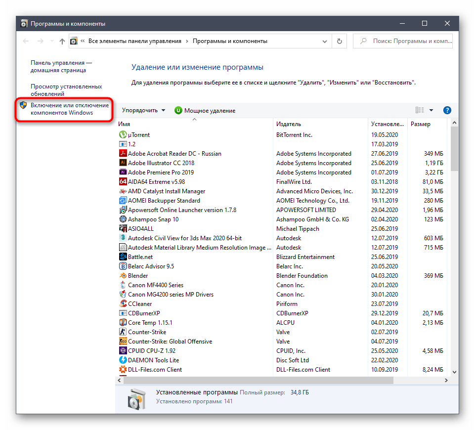 Через левую панель вызовите окно «Включение или отключение компонентов Windows».
