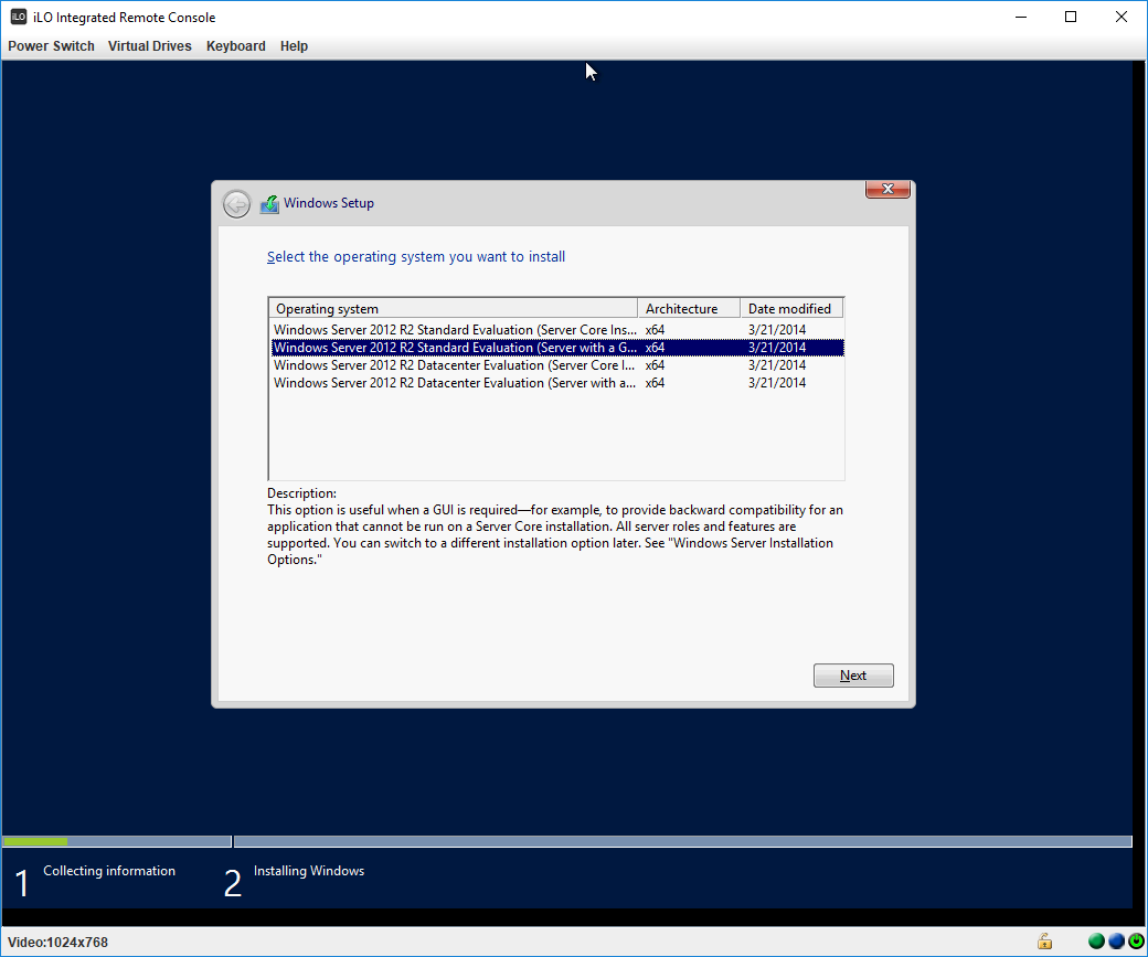 Выбираем версию установки, я выбираю Windows Server 2012 R2 Standard Evaluation with GUI. Next.