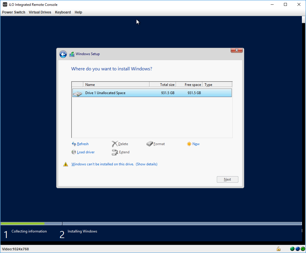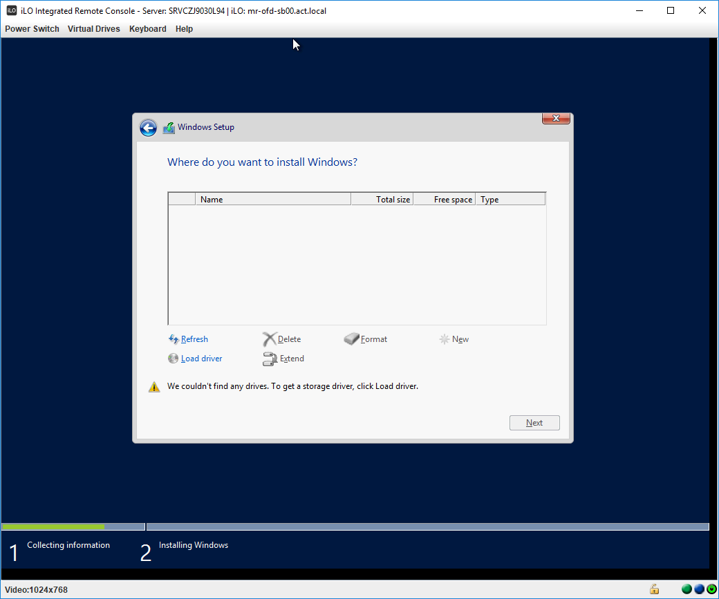 Упс. We couldn’t find any drives. To get storage driver, click Load driver. Инсталлятор не понимает что за RAID контроллер у нас и предлагает скормить ему драйвер.
