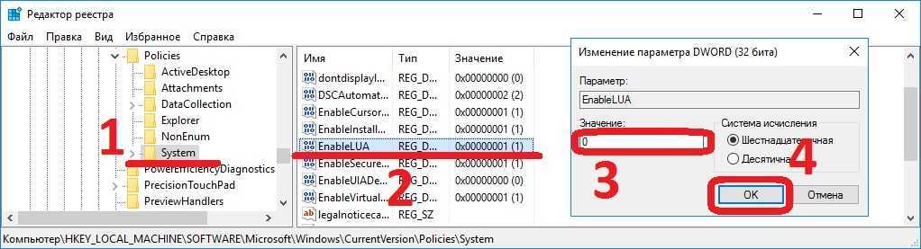 Теперь в правой части окна находим ключ EnableLUA и кликаем по нему двойным щелчком мышки. В поле Значение меня 1 на и нажимаем кнопку OK