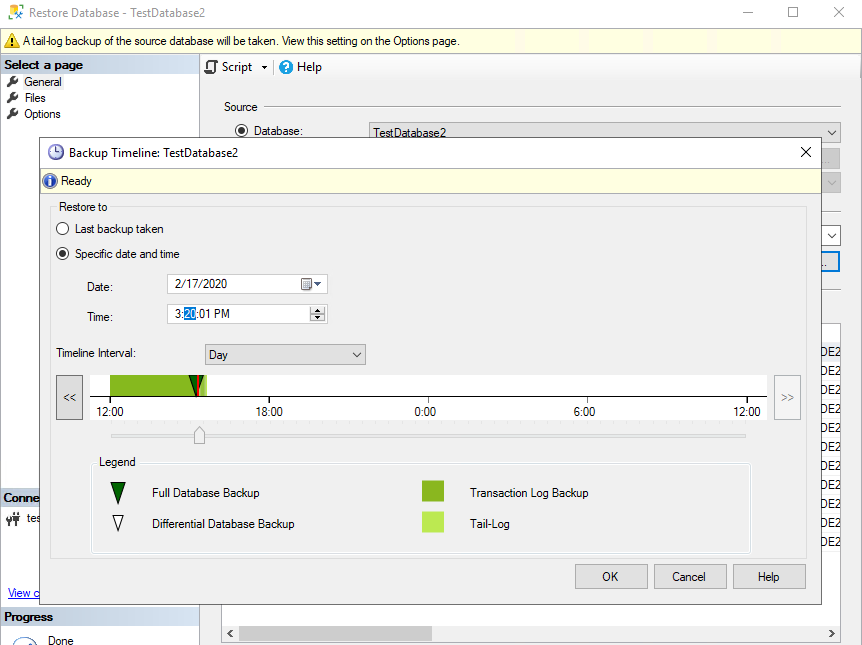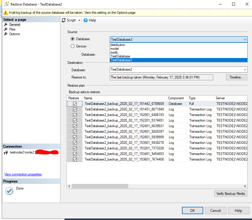 USE ALTER DATABASE SET SINGLE_USER WITH ROLLBACK IMMEDIATEBACKUP LOG TO DISK = N’E:MSSQL15.NODE2MSSQLBackupTestDatabase2_LogBackup_2020-02-17_15-39-43.bak’ WITH NOFORMAT, NOINIT, NAME = N’TestDatabase2_LogBackup_2020-02-17_15-39-43′, NOSKIP, NOREWIND, NOUNLOAD, NORECOVERY, STATS = 5RESTORE DATABASE FROM DISK = N’E:MSSQL15.NODE2MSSQLBackupfull.bak’ WITH FILE = 1, NORECOVERY, NOUNLOAD, STATS = 5RESTORE LOG FROM DISK = N’E:MSSQL15.NODE2MSSQLBackuptrans.bak’ WITH FILE = 1, NORECOVERY, NOUNLOAD, STATS = 5RESTORE LOG FROM DISK = N’E:MSSQL15.NODE2MSSQLBackuptrans.bak’ WITH FILE = 2, NOUNLOAD, STATS = 5, STOPAT = N’2020-02-17T15:38:23′ALTER DATABASE SET MULTI_USERGO