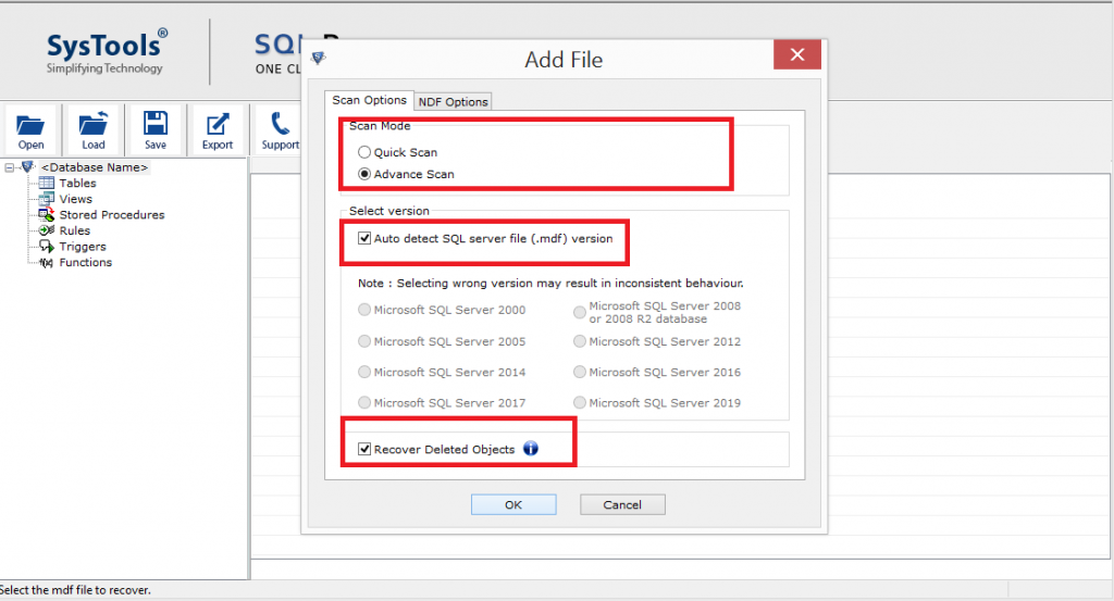 2. Теперь выберите Файл MDF, Выбирать Расширенное сканирование вариант, а также выберите версию SQL Server. (Отметьте опцию восстановления удаленных объектов, если вы хотите восстановить удаленные данные)