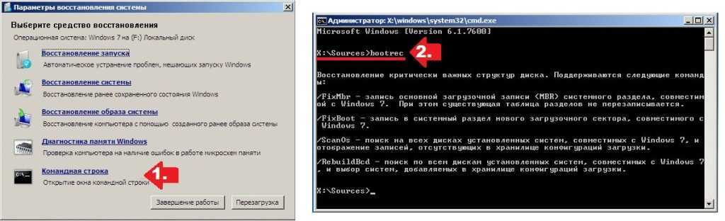 Повторяя действия, указанные в шаге № 2, входим в командную строку, вбиваем задачу Bootrec.exe и жмем Enter: