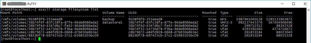 Подключаемся к серверу ESXi по SSH, монтируем NFS с бэкапами и проверяем результат. Формат команды для монтирования NFS следующий: