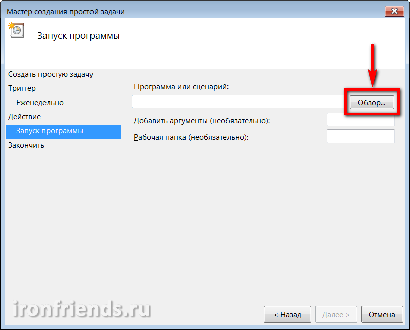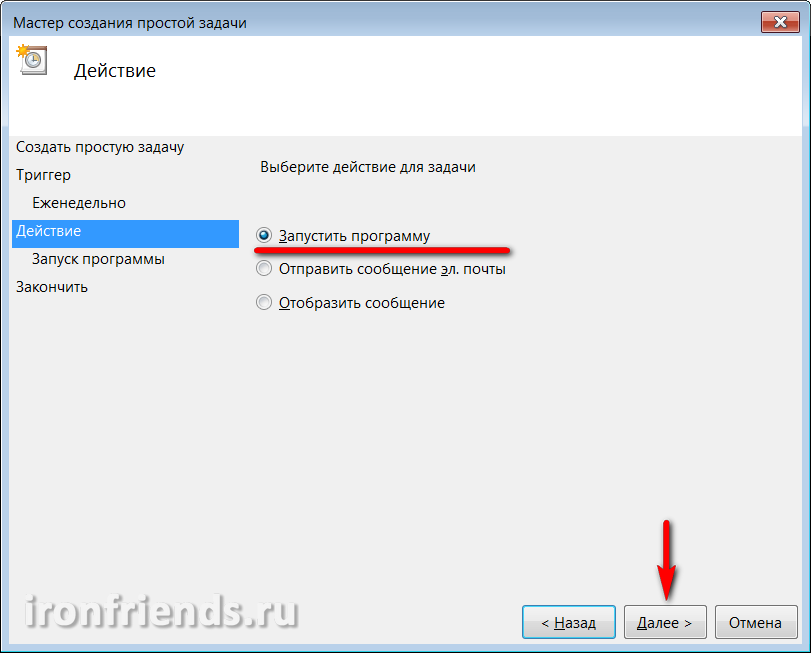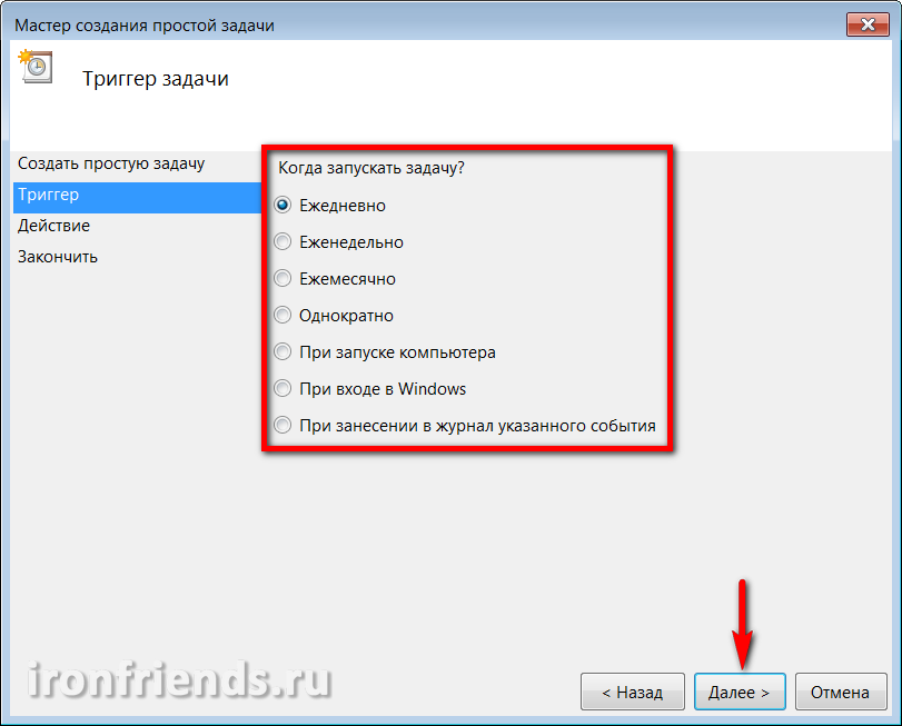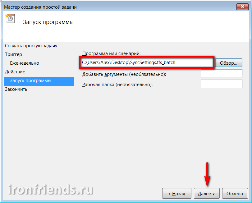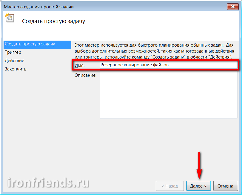 Введите осмысленное имя задачи и кликните на кнопку «Далее».