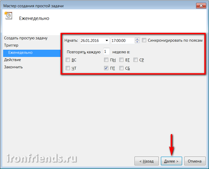 Затем определите более точно день и время, в которые компьютер с большой вероятностью будет включен для выполнения синхронизации. Например, каждую пятницу в 17:00.