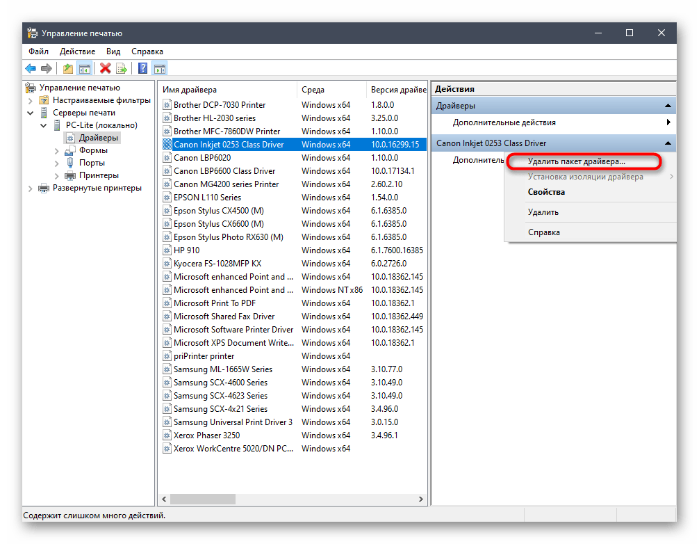 Не удалось удалить драйвер принтера (модель). Указанный драйвер принтера занят