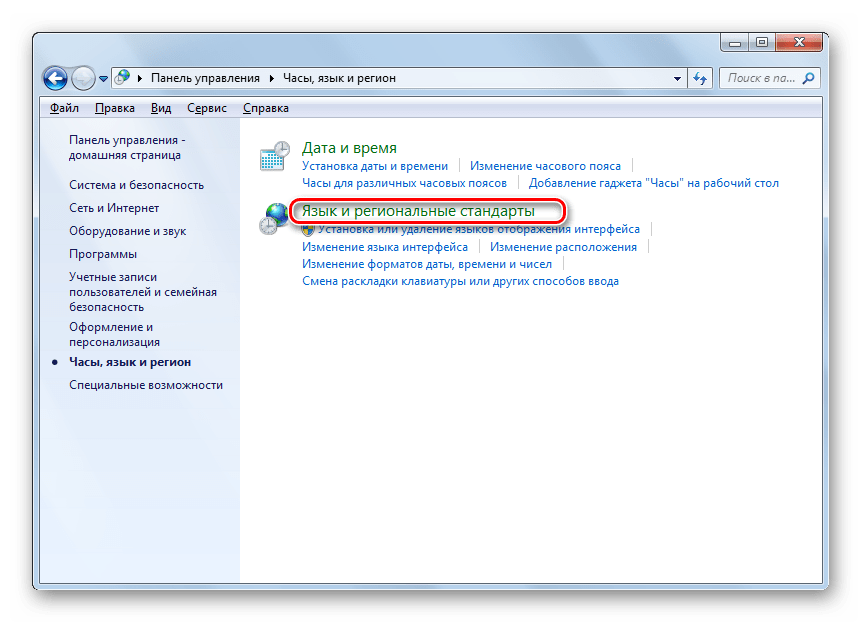 Далее щелкайте по наименованию «Язык и региональные стандарты».
