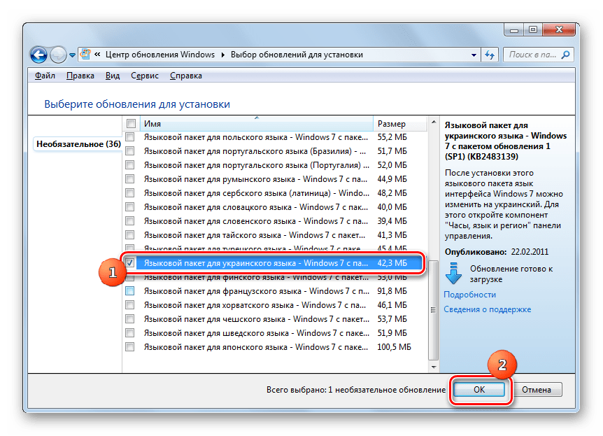 Существует два способа установки: автоматический и ручной. В первом случае загрузка языкового пакета происходит через «Центр обновлений», а во втором проводится инсталляция заранее скачанного или перенесенного другими средствами на компьютер файла. Теперь рассмотрим каждый из этих вариантов более подробно.