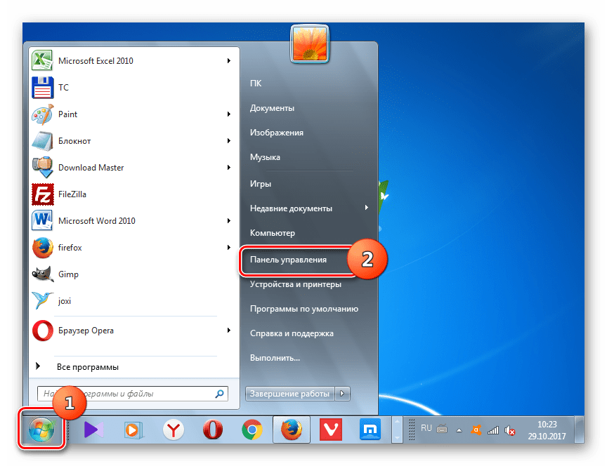 - Щелкайте меню «Пуск». Переходите в «Панель управления».