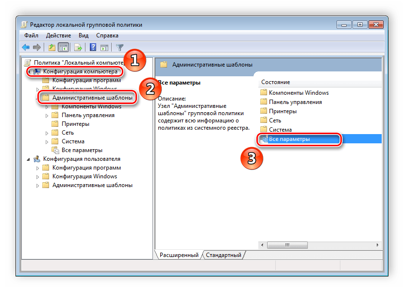 - Выберите, например, «Конфигурация компьютера», откройте раздел «Административные шаблоны» и перейдите в «Все параметры».