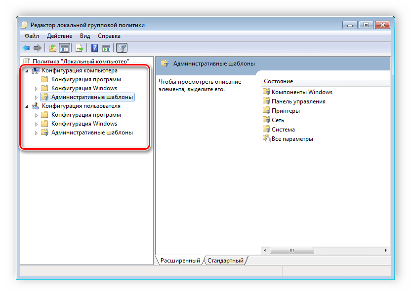 - «Административные шаблоны» — пункт содержит перечень всех настроек, которые доступны для пользователя через «Панель управления».