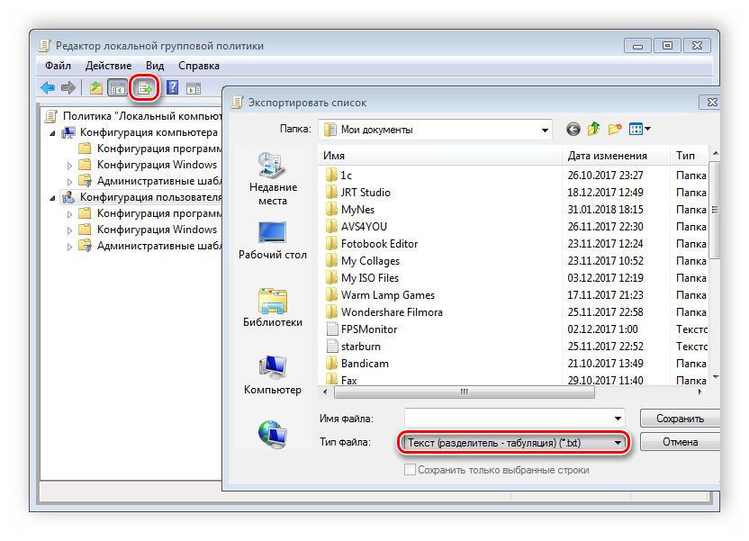 Если все-таки появляется необходимость найти определенный параметр, то сделать это можно только путем экспорта списка в текстовый формат, а потом уже через, например Word, осуществлять поиск. В главном окне редактора есть специальная функция «Экспорт списка», он переносит все политики в формат TXT и сохраняет в выбранном месте на компьютере.