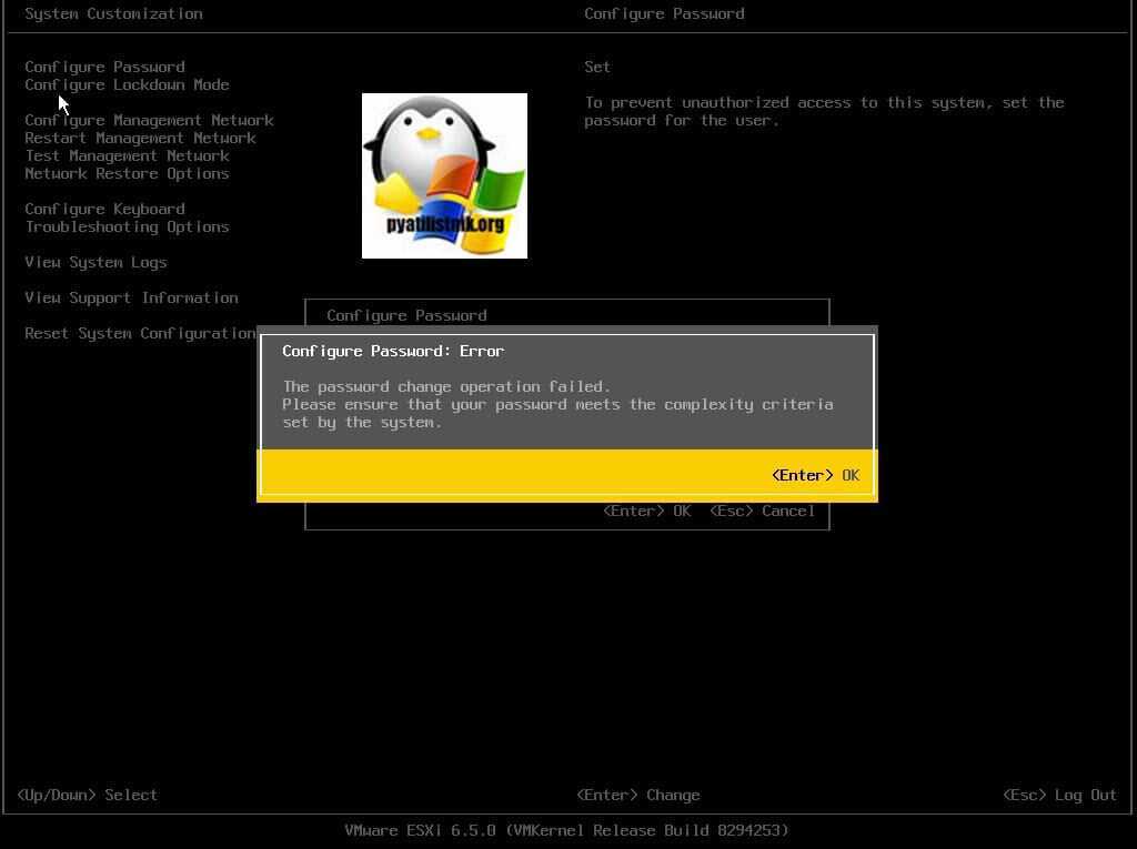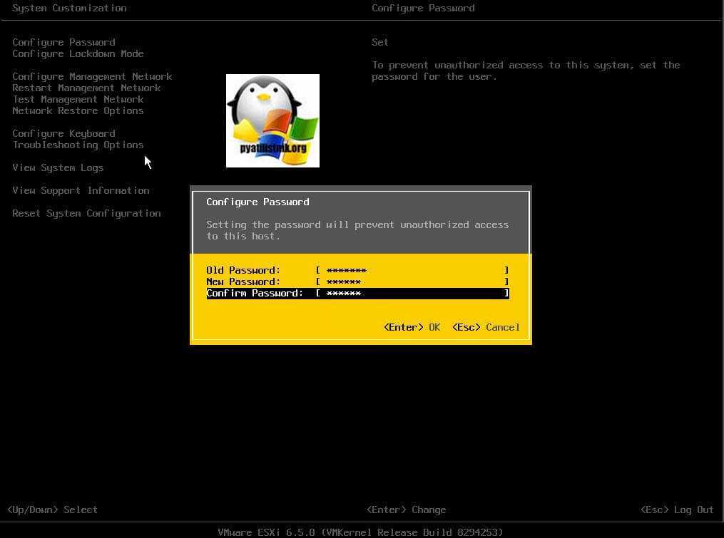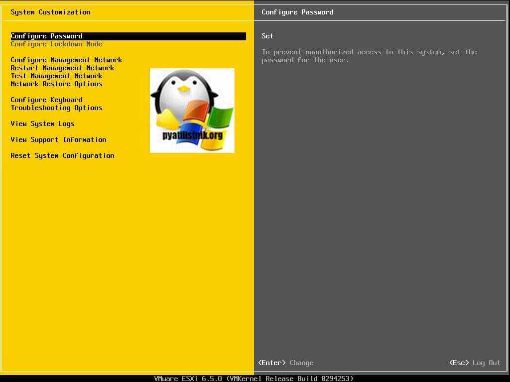 Direct Console User Interface (DCUI) — это первый инструмент после установки гипервизора, который видит администратор. Серо-желтый интерфейс с минимализмом, но с большой функциональностью. И так залогиньтесь через DCUI интерфейс и перейдите в меню «Configure Password». Нажмите Enter.