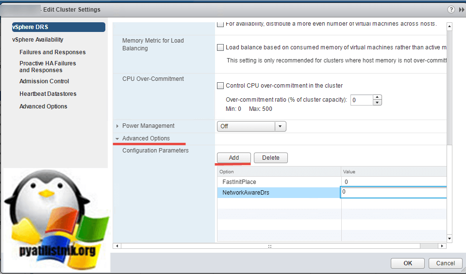Теперь, что ваш режим «Manual» давал выбор хостов при старте, вам нужно для параметров «FastInitPlace» и «NetworkAwareDrs» выставить значения «0». Открываем настройки RDS кластера и переходим в раздел «Advanced Options» и с помощью кнопки «Add» добавляете оба ключа, в значении (Value) ставите «0».