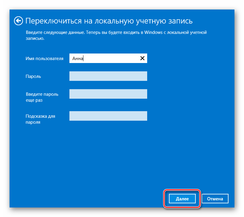 Затем вам предложат ввести имя пользователя для локальной учетной записи и ввести новый пароль. Так как мы хотим убрать ввод пароля вовсе, то ничего не вводите в данные поля. Нажмите «Далее».