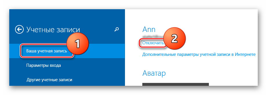 Затем в пункте «Ваша учетная запись» вы найдете свое имя и почтовый ящик Майкрософт. Под этими данными найдите кнопку «Отключить» и нажмите на нее.