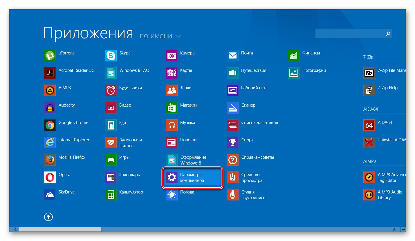 - Зайдите в меню «Параметры компьютера», которое вы можете найти в списке приложений Windows или же через боковую панель Charms.