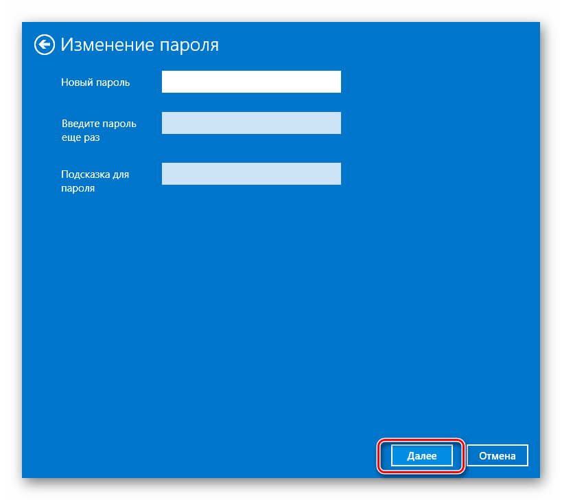 Теперь вы можете вводить новый пароль и какую-нибудь подсказку к нему. Но так как мы хотим сделать сброс пароля, а не изменить его, не вводите ничего. Нажмите «Далее».