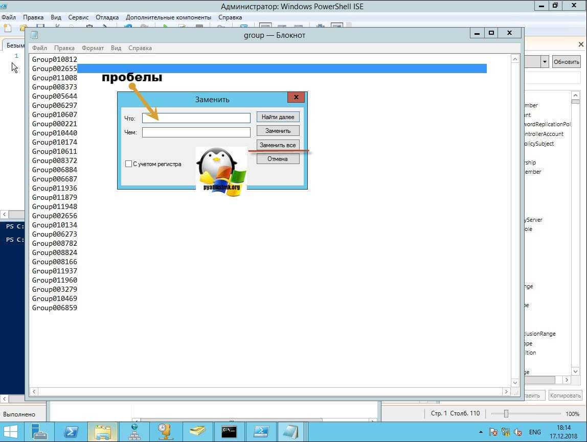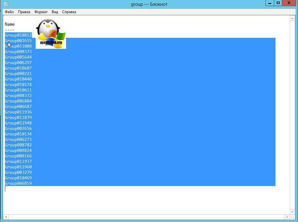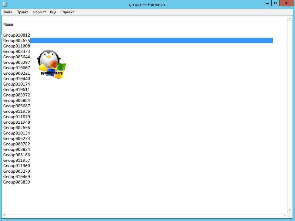 Get-ADGroup -fi * -SearchBase «OU=Groups,DC=root,DC=pyatilistnik,DC=org» | ft Name | Out-File C:\t1\group.txt