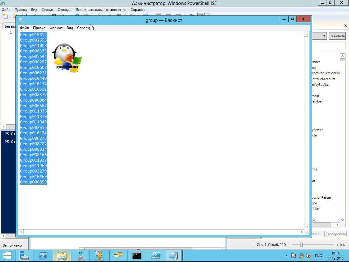 #Цикл по извлечению списка групп из файла $Filename = «C:\t1\group.txt»