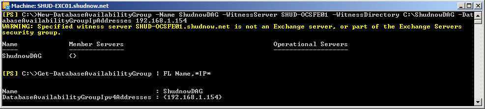 New-DatabaseAvailabilityGroup -Name ShudnowDAG -WitnessServer SHUD-OCSFE01 -WitnessDirectory C:\ShudnowDAG -DatabaseAvailabilityGroupIPAddresses 192.168.1.154