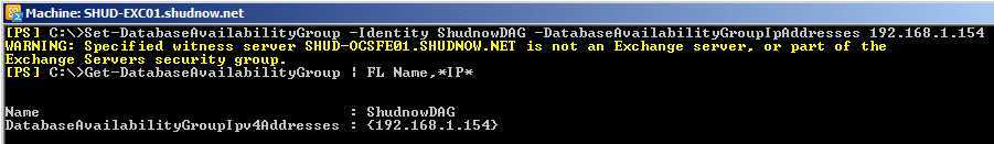 Set-DatabaseAvailabilityGroup -Identity ShudnowDAG -DatabaseAvailabilityGroupIPAddresses 192.168.1.154